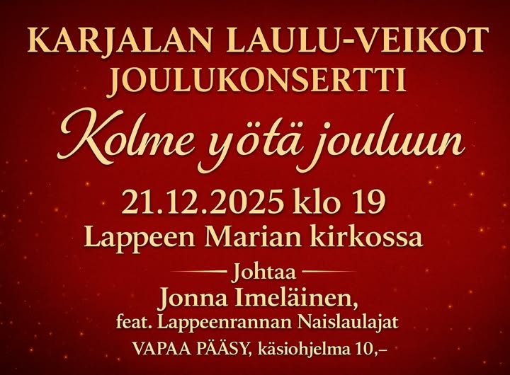 Mitäpä olisi joulu ilman Karjalan Laulu-Veikkojen perinteistä joulukonserttia? Tervetuloa rauhoittumaan ja laskeutumaan joulun tunnelmaan upeaan Lappeen Marian kirkkoon. Mukana myös ihanat Lappeenrannan Naislaulajat.