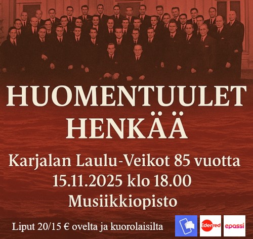 85-vuotista taivalta juhlitaan laulaen! Esitämme uuden johtajamme kera uusia ja vanhoja mieskuorolaulun helmiä Sibeliuksesta ja Madetojasta Leevi & the Leavingsin ja Lapinlahden lintujen sovituksiin. Mukana menossa on myös ystäviämme vuosien varrelta: nykyisin Kuoromiehissä vaikuttavat Karjalan Laulu-Veikkojen Silver Foxit ja Viipurin Lauluveikkojen iskuryhmä. Tervetuloa viihtymään! Liput 20/15 € (alennus opiskelijat ja eläkeläiset) kuorolaisilta ja ovelta. Maksutavat Epassi, Edenred, MobilePay, kortti ja käteinen.